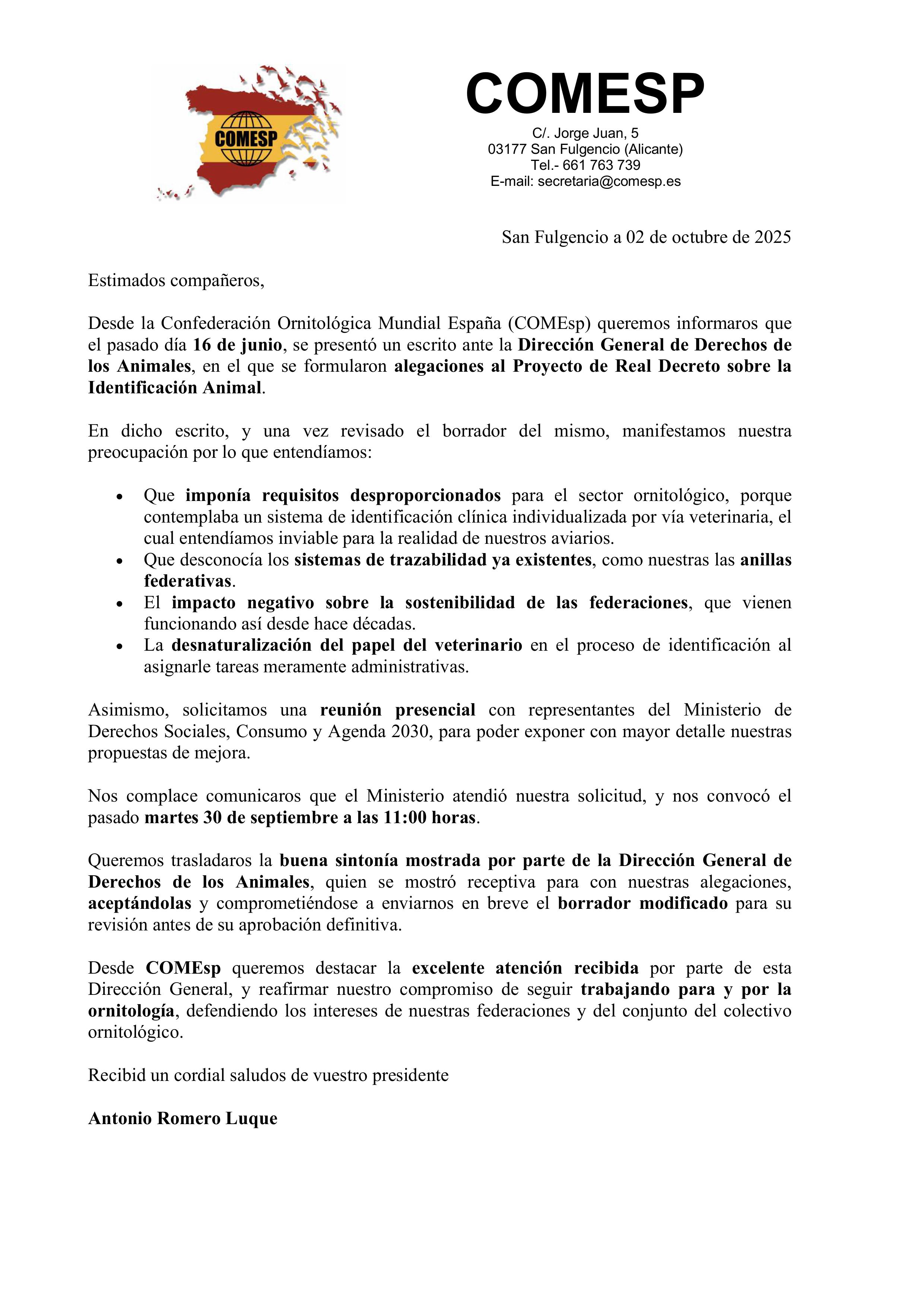 El pasado 16 de junio, a través de COMESP, se presentaron alegaciones al borrador del nuevo Real Decreto sobre Identificación Animal, mostrando nuestra preocupación por algunos puntos que no se adaptaban a la realidad de nuestros aviarios.