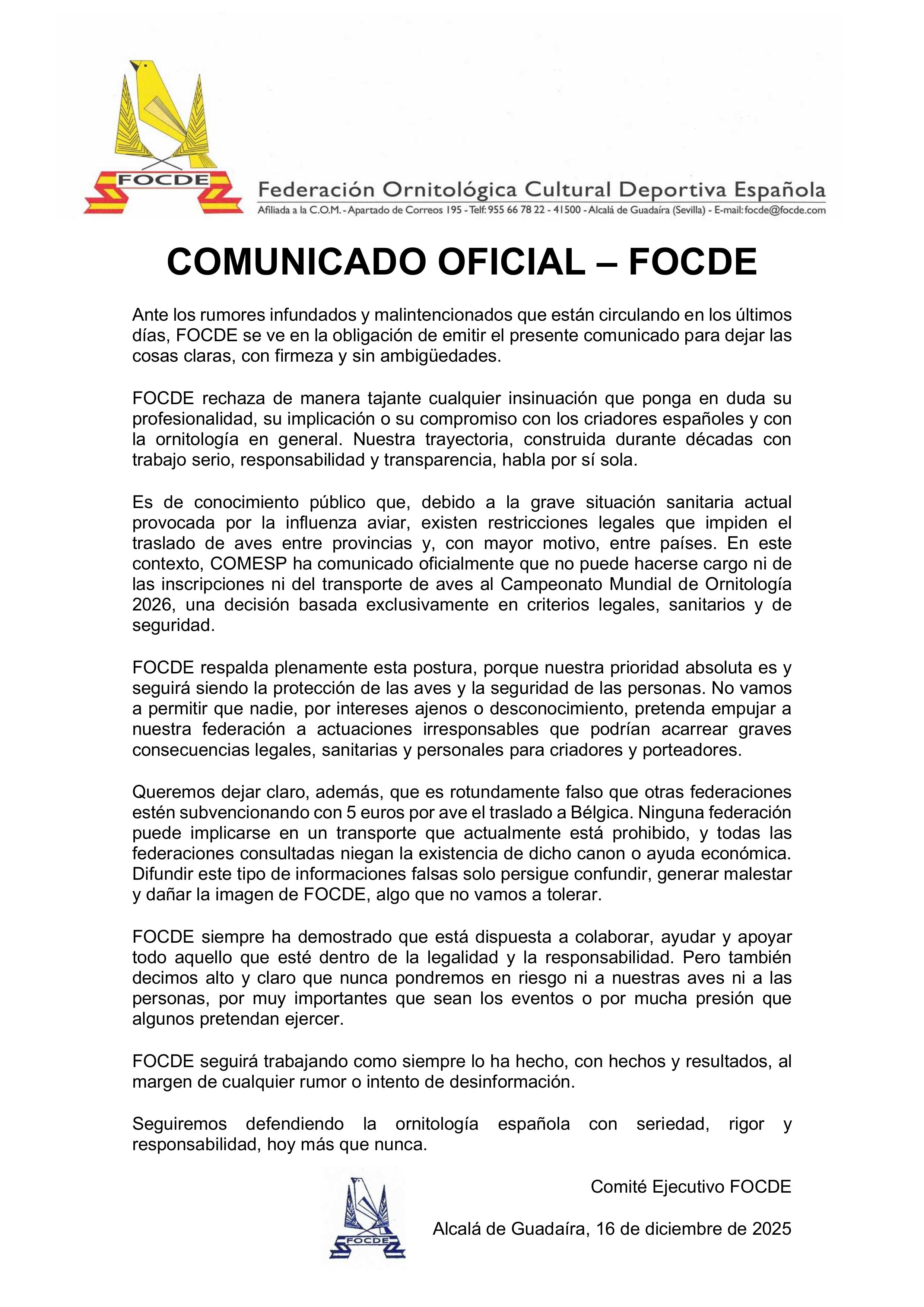 Queremos dejar claro, además, que es rotundamente falso que otras federaciones estén subvencionando con 5 euros por ave el traslado a Bélgica. Ninguna federación puede implicarse en un transporte que actualmente está prohibido, y todas las federaciones consultadas niegan la existencia de dicho canon o ayuda económica. Difundir este tipo de informaciones falsas solo persigue confundir, generar malestar y dañar la imagen de FOCDE, algo que no vamos a tolerar.